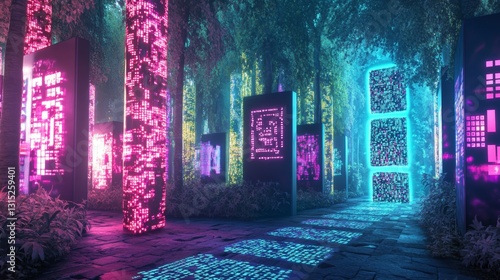 Canvas Prints a neon sign with a blue light is lit up in a forest. the sign is surrounded by trees and has a blue  - Canvas Prints Canvas Prints a neon sign with a blue light is lit up in a forest. the sign is surrounded by trees and has a blue - Canvas Prints