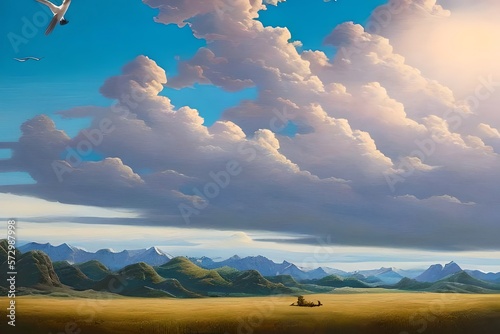 The watermark will not be included on Canvas Print.: A painting of a sky with clouds and a white bird flying in the sky with a blue sky in the background