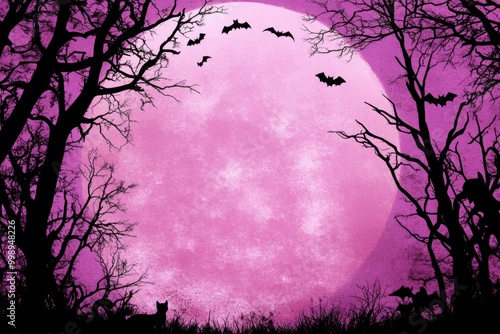 Canvas Print : A purple halloween background with black silhouettes of trees, bats, and howling wolves empty space