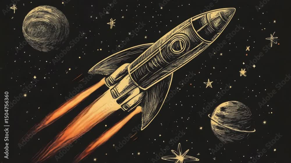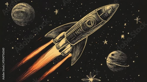The watermark will not be included on Canvas Print.: A rocket soars through the vastness of space, with stars and planets in the background