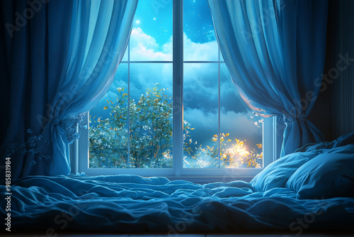 The watermark will not be included on Canvas Print.: A serene bedroom window with curtains gently swaying, allowing a soft moonlight to filter in - concep