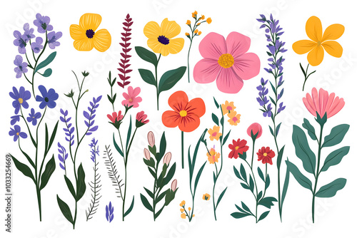 The watermark will not be included on Canvas Print.: A set of fun flower and nature design elements - flat hand drawn vector collection