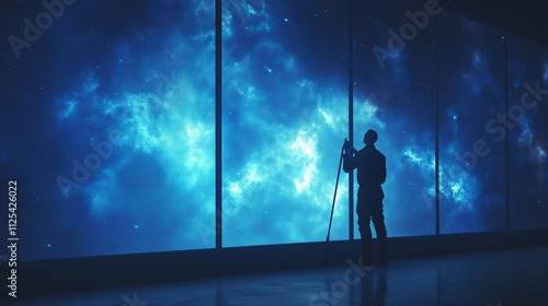 The watermark will not be included on Canvas Print.: A silhouette of a janitor cleaning a large window with a cosmic view of stars and nebulae in outer s