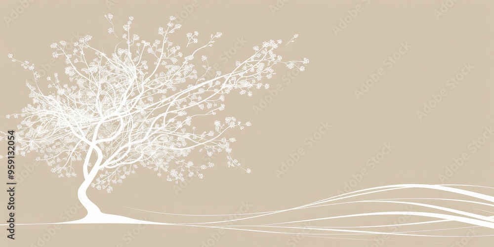 Canvas Prints a simple white line drawing on a beige background of a tree with flowing branches and leaves. the ne - Canvas Prints Canvas Prints a simple white line drawing on a beige background of a tree with flowing branches and leaves. the ne - Canvas Prints