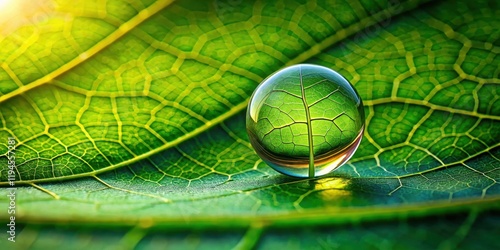 The watermark will not be included on Canvas Print.: A single water drop suspended on a large leaf's edge, reflecting the vibrant hues of the surrounding