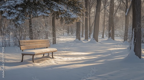 The watermark will not be included on Canvas Print.: A snow-covered bench in a quiet park, with soft light filtering through the trees
