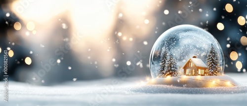 The watermark will not be included on Canvas Print.: A snow globe encapsulating a house within, surrounded by a snow-laden field trees and twinkling ligh