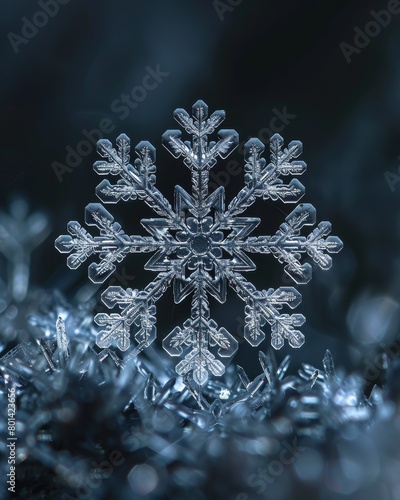 The watermark will not be included on Canvas Print.: A snowflake is sitting on a dark surface