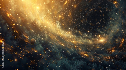 The watermark will not be included on Canvas Print.: A space scene with a spiral galaxy and a planet