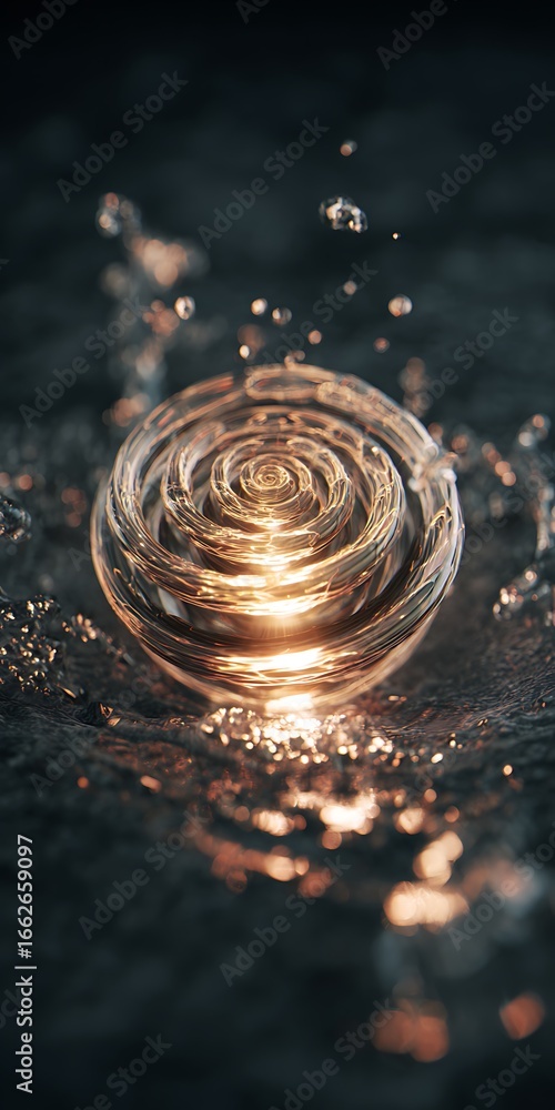 The watermark will not be included on Canvas Print.: A sphere surrounded by water splashes creates an abstract and dynamic design, with a modern and arti