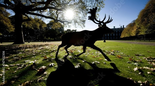 Canvas Prints a statue of a deer in the middle of a grassy area with leaves on the ground and a building in the ba - Canvas Prints Canvas Prints a statue of a deer in the middle of a grassy area with leaves on the ground and a building in the ba - Canvas Prints