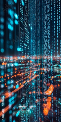 The watermark will not be included on Canvas Print.: A striking abstract representation of digital data visualization captured at night, showcasing urban