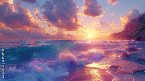 Canvas Print : A stunning beach sunset with waves crashing on the shore and colorful clouds in the sky, creating a