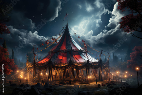 Canvas Prints a surreal circus tent with acrobats performing gravity-defying stunts under a starry sky, creating a