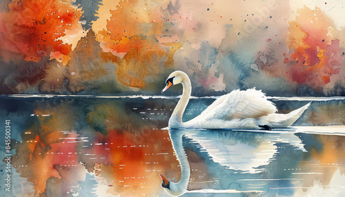 The watermark will not be included on Canvas Print.: A swan is swimming in a pond with orange leaves floating on the surface