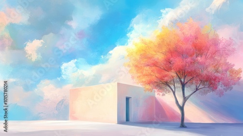 Canvas Prints a tree with pink leaves is in front of a white building - Canvas Prints Canvas Prints a tree with pink leaves is in front of a white building - Canvas Prints