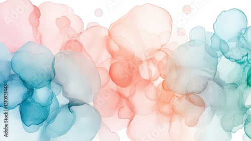 The watermark will not be included on Canvas Print.: A vibrant display of abstract watercolor blobs in soft pastels, featuring swirls of blue, coral, and