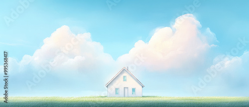 Canvas Prints a white house is standing in a field with a blue sky in the background