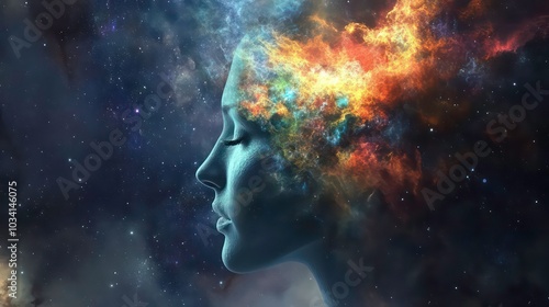 Canvas Prints a woman's profile with a colorful nebula exploding from her head against a starry background.