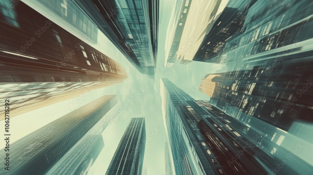 The watermark will not be included on Canvas Print.: A worm's-eye view of skyscrapers reaching towards a cloudy sky -