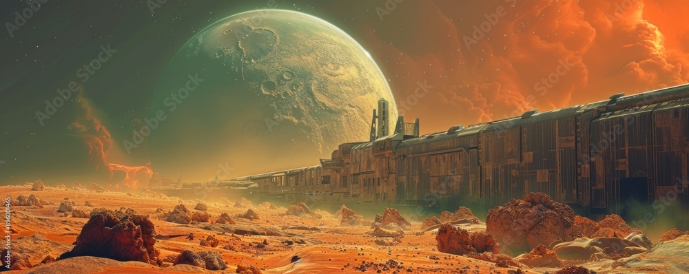 The watermark will not be included on Canvas Print.: Abandoned space station orbiting a distant planet -