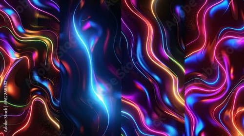The watermark will not be included on Canvas Print.: Abstract 3d render of four panels with colorful, glowing lines and waves -
