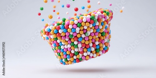 The watermark will not be included on Canvas Print.: Abstract 3d rendering featuring a spherical cup overflowing with colorful, small spheres in vibrant
