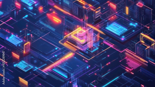 The watermark will not be included on Canvas Print.: Abstract 3d rendering of a futuristic cityscape with glowing neon lights and digital technology elem