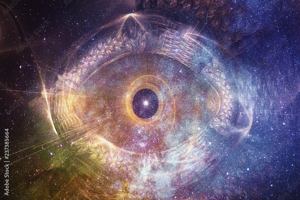 The watermark will not be included on Canvas Print.: Abstract artistic multicolored glowing galaxy with a digital eye in a space background
