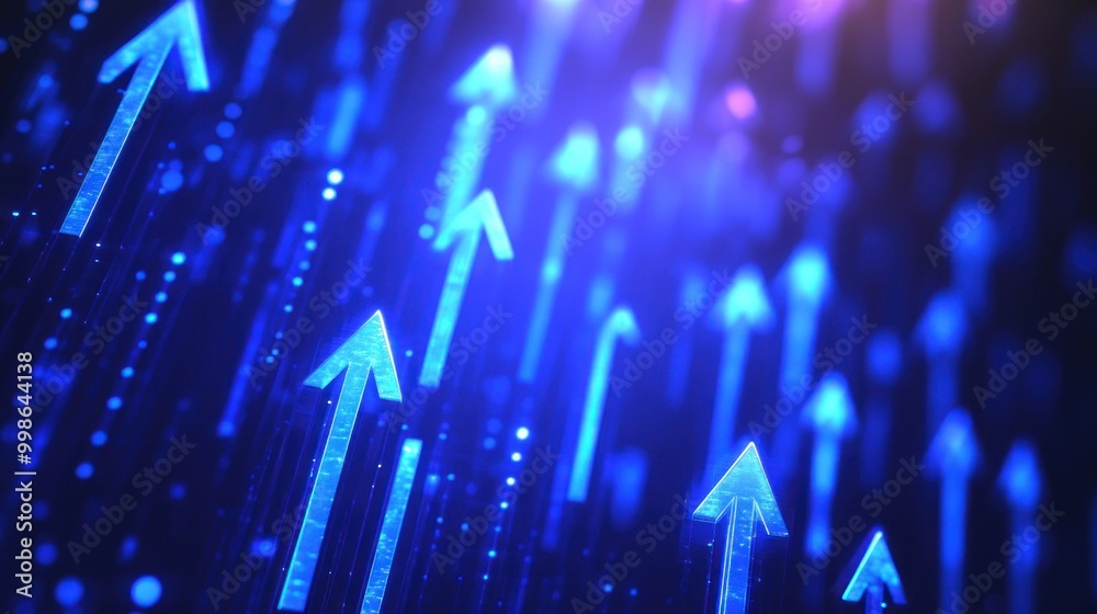 The watermark will not be included on Canvas Print.: Abstract background of blue glowing arrows pointing upwards -