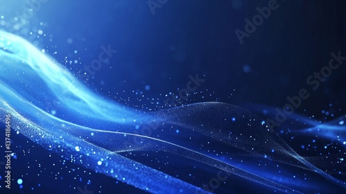 The watermark will not be included on Canvas Print.: Abstract background with a blue gradient, a futuristic cityscape, and flowing lines of light in the