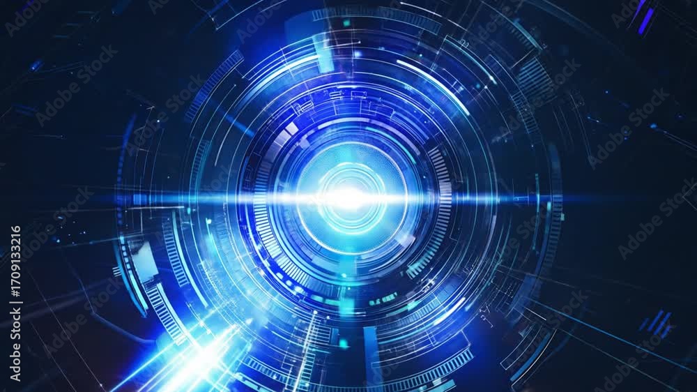 The watermark will not be included on Canvas Print.: Abstract blue and white concentric circles with a bright central light, creating a futuristic and te