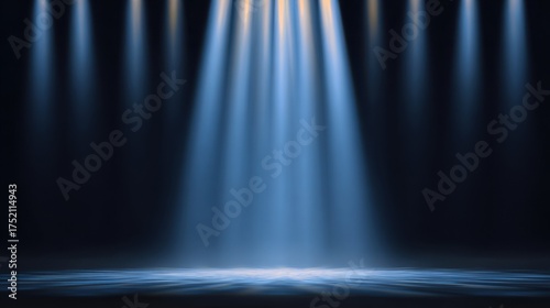 The watermark will not be included on Canvas Print.: Abstract blue stage background with a spotlight and vertical glowing lines