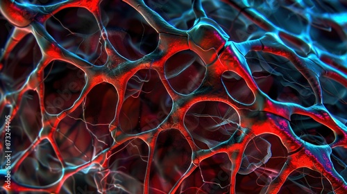 The watermark will not be included on Canvas Print.: Abstract close-up of interwoven red and blue organic-like textures forming a complex and intricate w