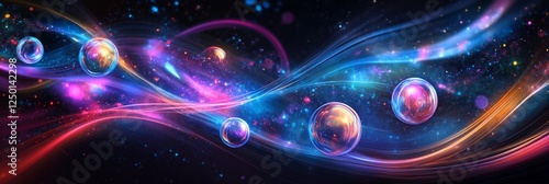 Canvas Print : Abstract cosmic art with glowing orbs and vibrant energy streams in a dark space -