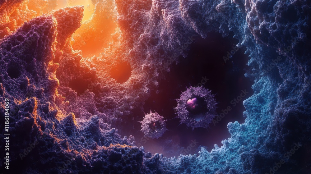 The watermark will not be included on Canvas Print.: Abstract cosmic landscape with glowing structures and spiky formations