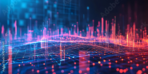 The watermark will not be included on Canvas Print.: Abstract dark blue background with many orange rays and dots pointing upward - neon colors