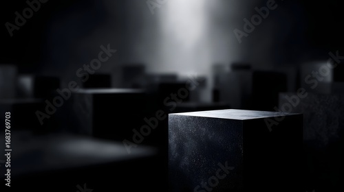 The watermark will not be included on Canvas Print.: Abstract dark geometric background featuring illuminated textured pedestals in a mysterious dimly li