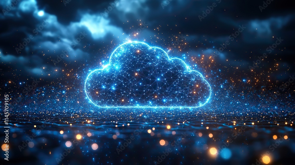 The watermark will not be included on Canvas Print.: Abstract data flows through a network of lines, representing cloud computing, user connections, and