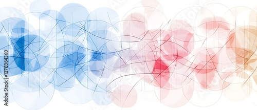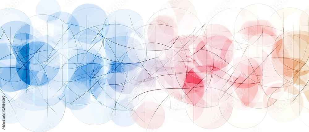 Canvas Print : Abstract design featuring soft blue and red watercolor shapes intertwined with delicate lines and do