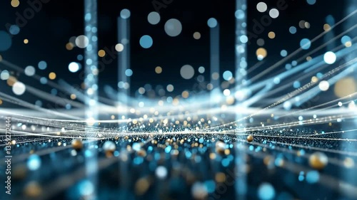 The watermark will not be included on Canvas Print.: Abstract digital futuristic design with blue gold particles bokeh and light streaks on dark backgrou