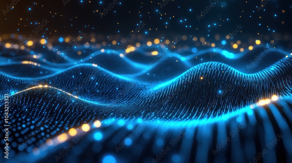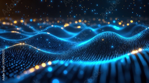 The watermark will not be included on Canvas Print.: Abstract digital grid with neon blue lines and glowing dots, representing a high-tech landscape