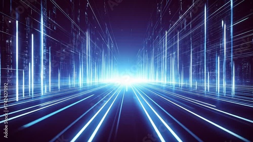 The watermark will not be included on Canvas Print.: Abstract digital tunnel with glowing blue lines converging towards a bright light at the end -