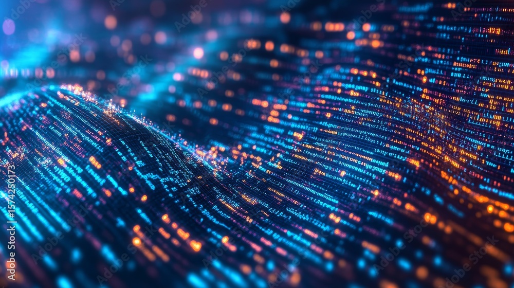 The watermark will not be included on Canvas Print.: Abstract digital waves filled with vibrant blue and orange lights - the image captures a mesmerizing