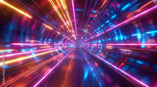 The watermark will not be included on Canvas Print.: Abstract flight in retro neon hyper warp space tunnel - 3d illustration of futuristic sci-fi concept