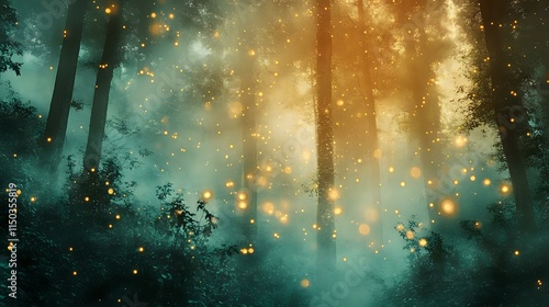 The watermark will not be included on Canvas Print.: Abstract forest background with ethereal amber and emerald tones, misty lights and sparkling dew dro