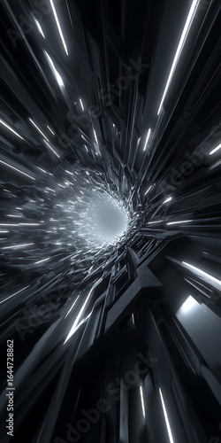 The watermark will not be included on Canvas Print.: Abstract futuristic tunnel background with glowing white lights and dark textures creating a sense o