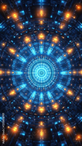 The watermark will not be included on Canvas Print.: Abstract futuristic tunnel of glowing blue and orange lights with circular geometric pattern and dar