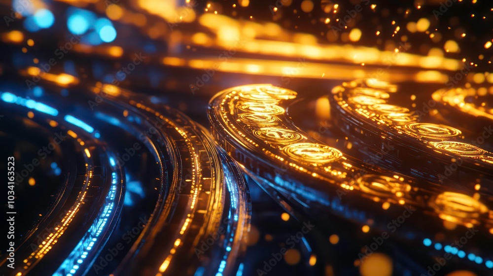 The watermark will not be included on Canvas Print.: Abstract glowing circular pattern with blue and orange light -
