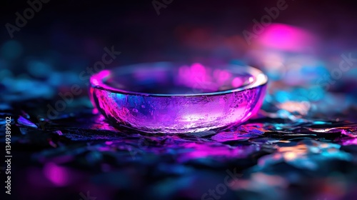 The watermark will not be included on Canvas Print.: Abstract glowing crystal bowl on textured surface, vibrant neon lights in background - possible use d